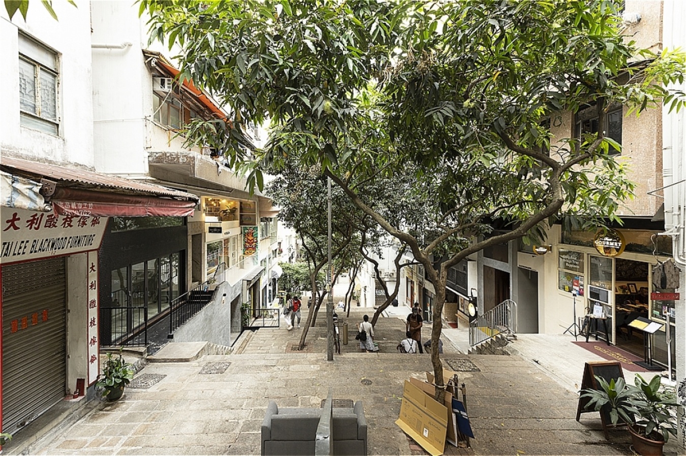 歴史建築や骨董街とヒップなブティック、B級グルメの名店と最先端のビーガンカフェなどが混在する中環(セントラル)の一角に、石畳の階段になった善慶街(Shin Hing Street)がある。