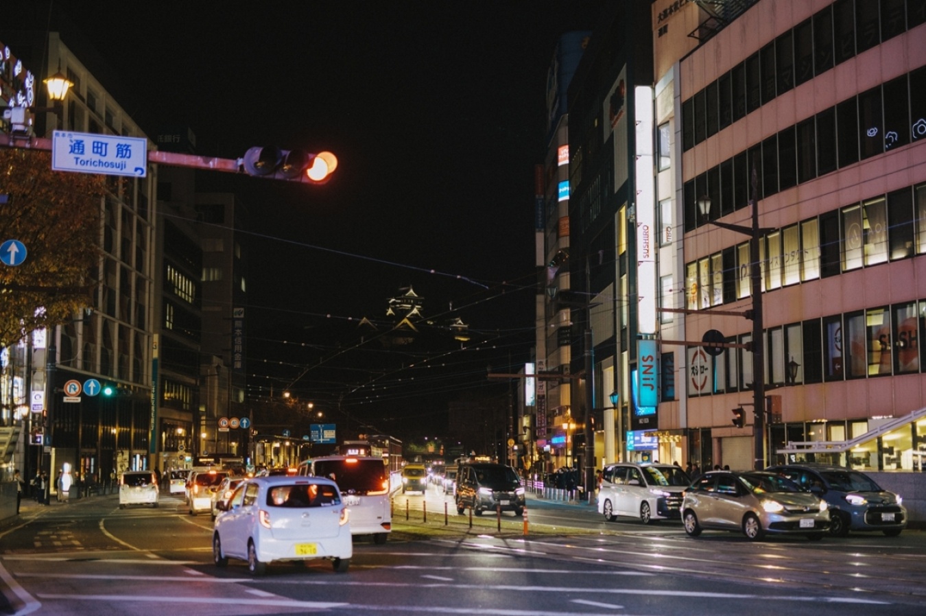 熊本城を望む、路面電車が走る通町筋。