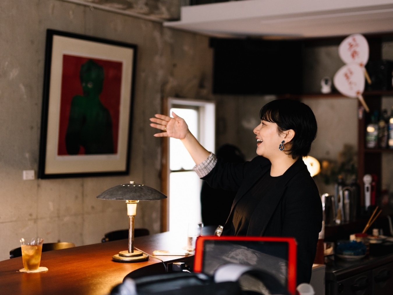 営業後の練習を終えてやってくる、すっかりできあがった若手バーテンダーたちを鮮やかにさばく手腕もかっこいい岩本さん。さすが元バーテンダー!奥に見えるのはTeiji Hayamaさんの作品「UNTITLED」。