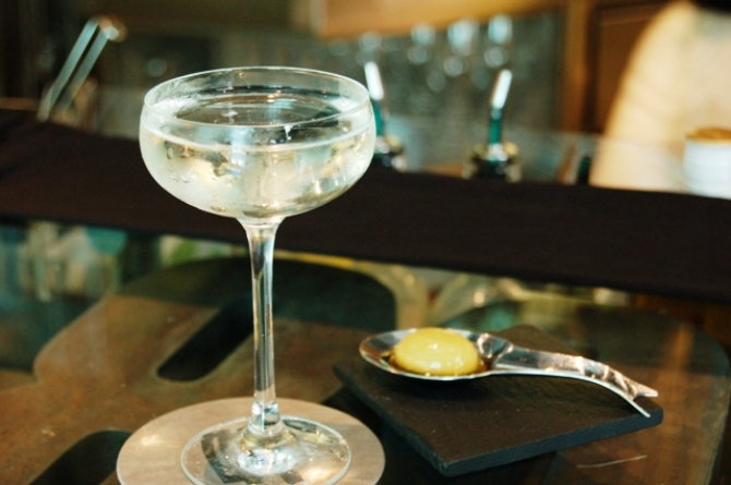 球体オリーブ!?を添えた、創作マティーニ。