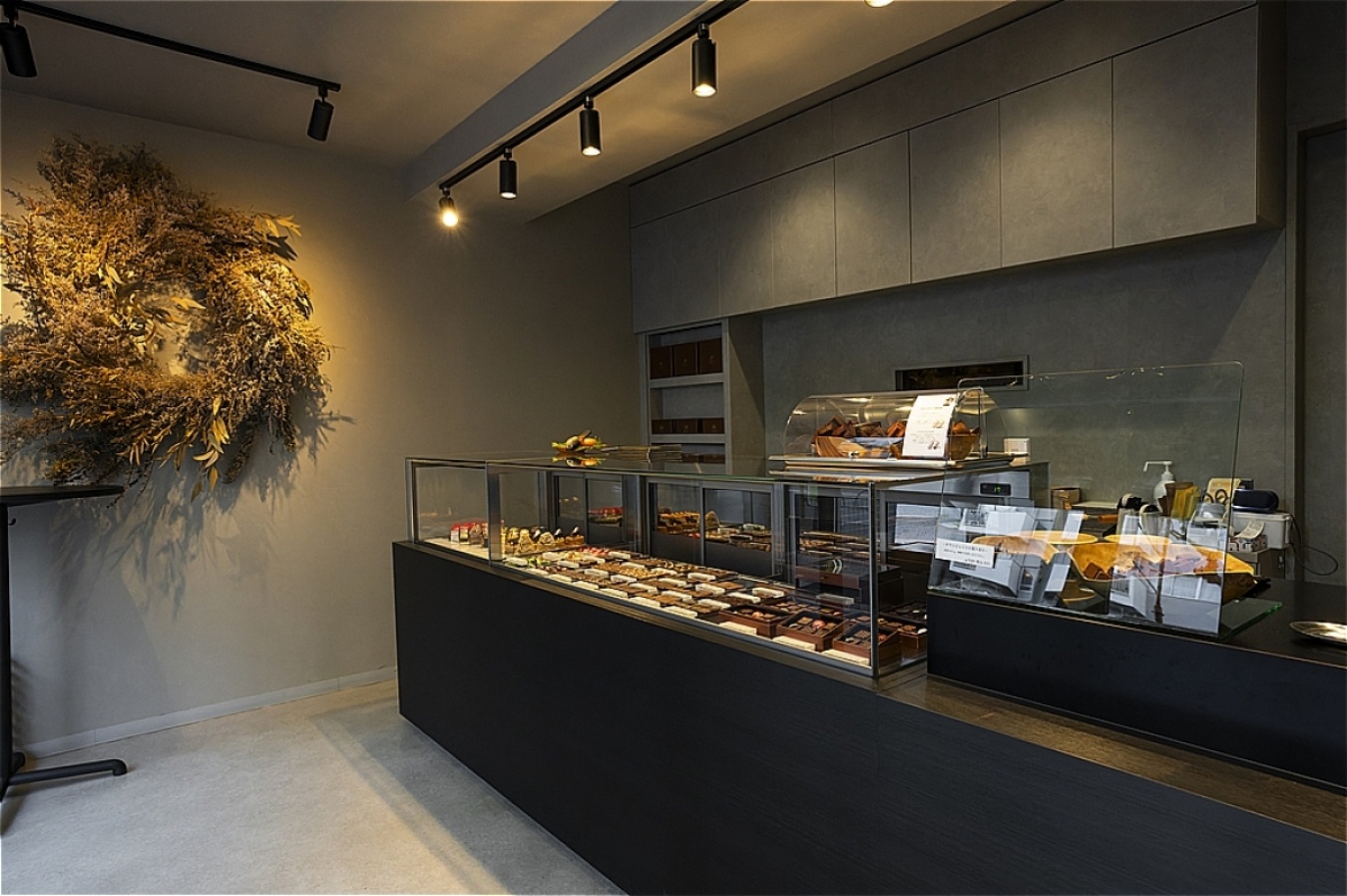 ブラック×グレーで統一されたスタイリッシュな店内には、一面にガラス張りのショーケースが配され、そのなかにちょっとしたジュエリーのようなボンボンショコラ(ひと口サイズのチョコレート)が美しく並んでいる。