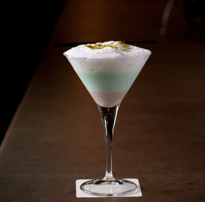 レモンパイ・マティーニ同様、パティスリー感覚で考案した最新作のカクテルです。3層それぞれの味わいやテクスチャーの違いはもちろん、冷たいリキュール部分とまだ温かいムースの温度差も、同時に楽しんでください。